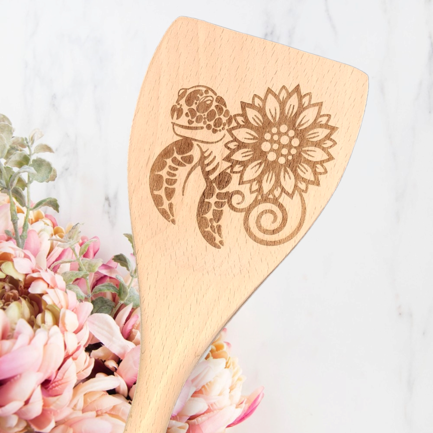 Cucharas de cocina de madera grabadas - Tropical - Tortuga Marina Girasol
