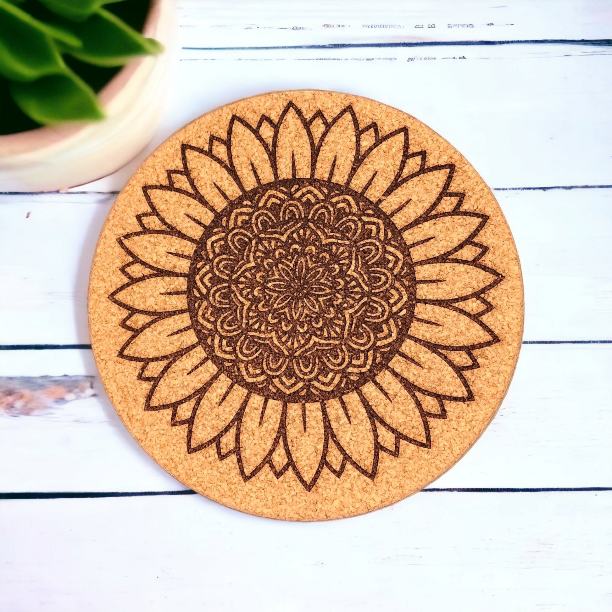 Mandala de girasol - Salvamanteles de corcho grabados de 7 pulgadas, almohadilla térmica, posavasos