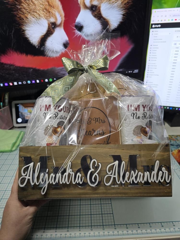 Start your custom gift basket with a beautiful rustic-looking wood box! Each crate is crafted from crafted out of cedar plywood and personalized with raised acrylic text — perfect for names, dates, or special messages. A stylish and sturdy foundation for wedding gifts, baby showers, or family keepsakes.